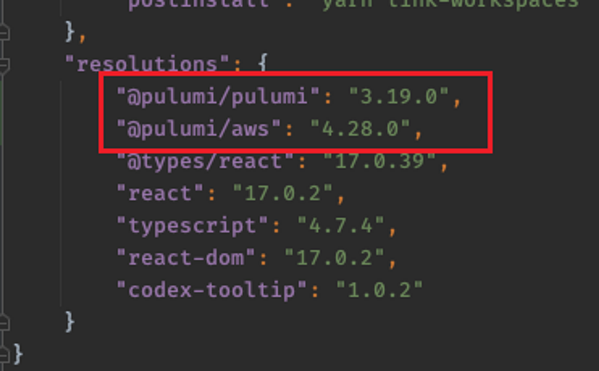 In the new project, we want to keep the same versions of Pulumi-related NPM packages. That’s why, we need to copy the related resolutions entries, located in root package.json file of our old project: